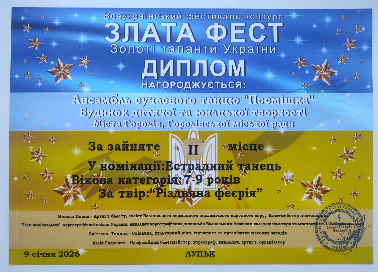 Вихованки Будинку дитячої та юнацької творчості міста Горохів Горохівської міської ради - ансамбль сучасного танцю ПОСМІШКА'' став срібним Призером на Всеукраїнському конкурсі мистецтв ''ЗЛАТАФЕСТ'', ''ЗОЛОТІ ТАЛАНТИ УКРАЇНИ ''